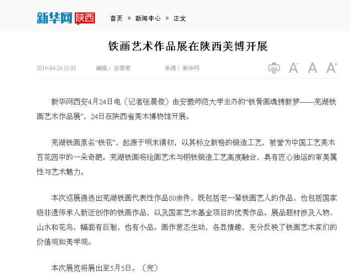 新华网西安4月24日电(记者张晨俊)由bwin必赢线路检测主办的“铁骨画魂铸新梦——芜湖铁画艺术作品展”,24日在陕西省美术博物馆开展。
