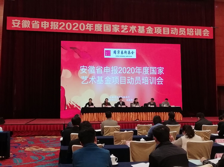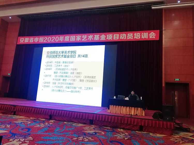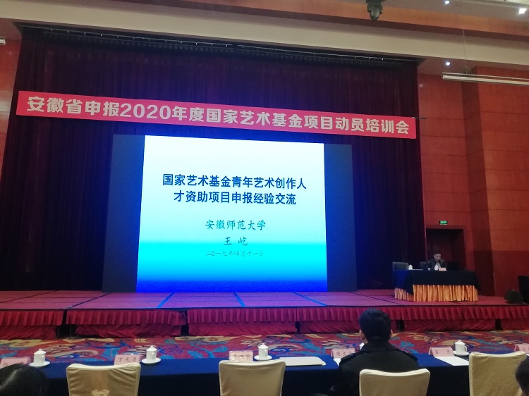4月11日,安徽省2020年度国家艺术基金项目申报动员培训会在合肥召开,全省各市、省直管县文化和旅游局、有关演艺单位、高校等单位270余人参加了培训会。437ccm必赢国际版教师王屹、刘坛茹、罗宗勇等人参与了会议,并在会议上发言,介绍申报项目的成功经验。