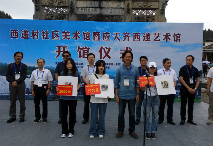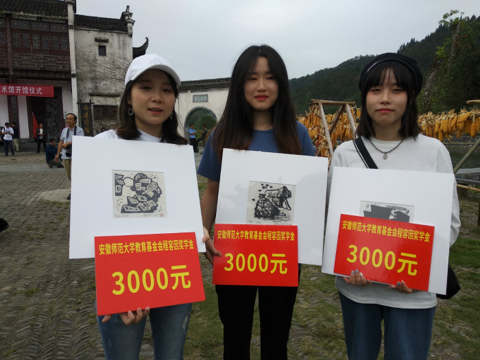 本网讯(437ccm必赢国际版 王伟)9月4日下午,bwin必赢线路检测教育基金会“程容因奖学金”颁发大会在安徽黄山西递古镇的牌楼广场举行。著名版画家应天齐和来自全国的15名专家代表,bwin必赢线路检测教育基金会代表,437ccm必赢国际版院长高飞,437ccm必赢国际版党委副书记朱琳,437ccm必赢国际版教师代表和全体版画专业学生参加了颁发大会。