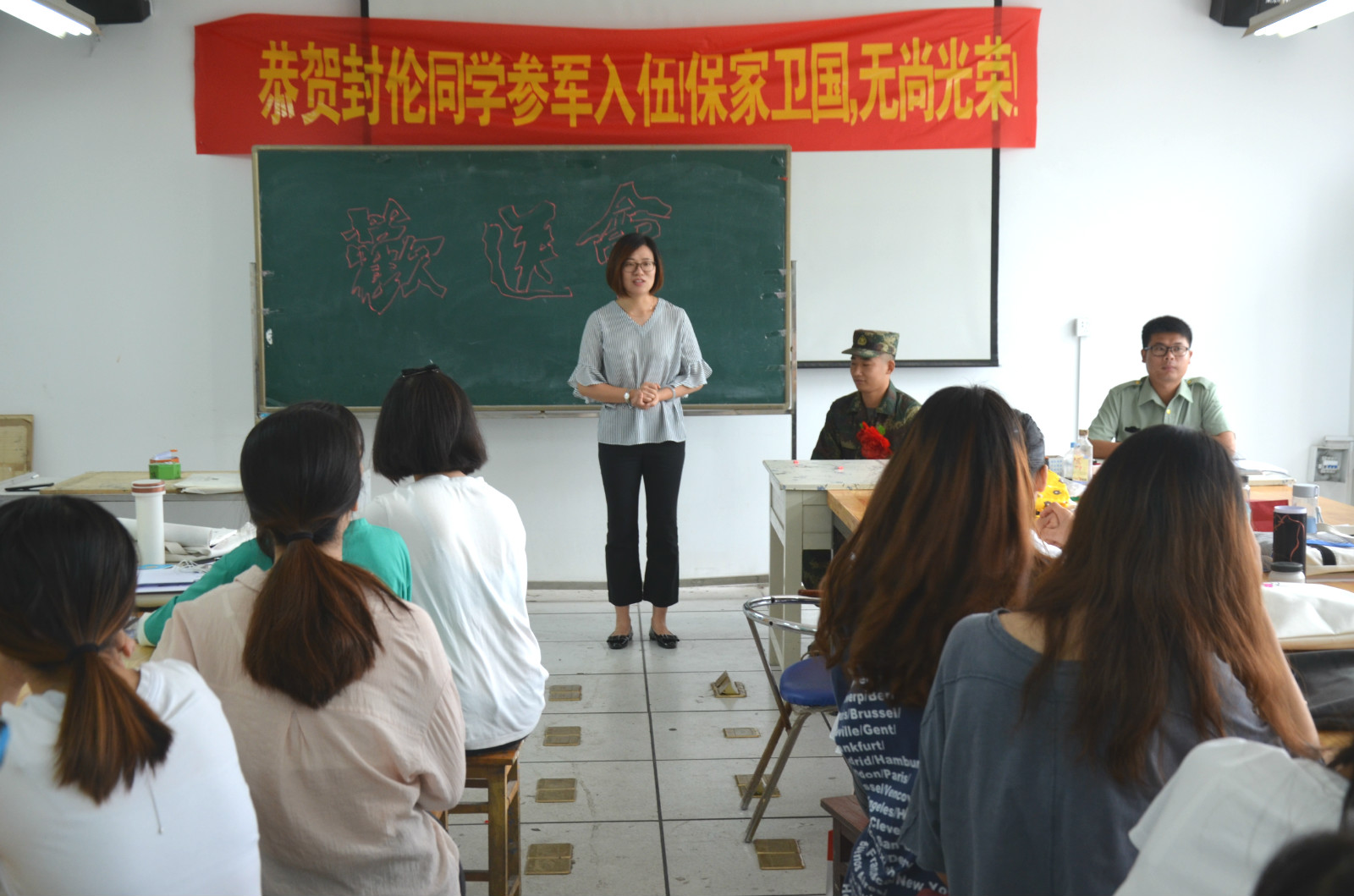欢送会上,2015级视觉传达班班长蒋倩对封伦同学做了简要介绍,班级同学纷纷送上美好祝福。朱琳代表学院对即将奔赴军营的封伦同学表示祝贺,并提出了四点希望:一要不忘学习,提高素养。充分发挥大学生兵源质量好、素质高的优势,在部队不要忘记理论只是的学习,在文化知识传播上带好头;二要尽快适应,完成转变。适应部队新环境,服从部队管理,尽快完成从一名大学生到一名军人的角色转变;三要不忘初心、牢记使命。时刻牢记自己是一名师大学子,听从指挥,尊重首长,积极上进,把师大精神带到部队去,为部队建设贡献自己的力量;四要保重自己,保持联系。在艰苦的训练中保重自己,随时随地向父母、老师和同学报平安。最后,封伦在发表入伍感言,他表示将牢记学校嘱托,到部队后,一定刻苦锻炼、献身国防,不辜负祖国和学校的期望。