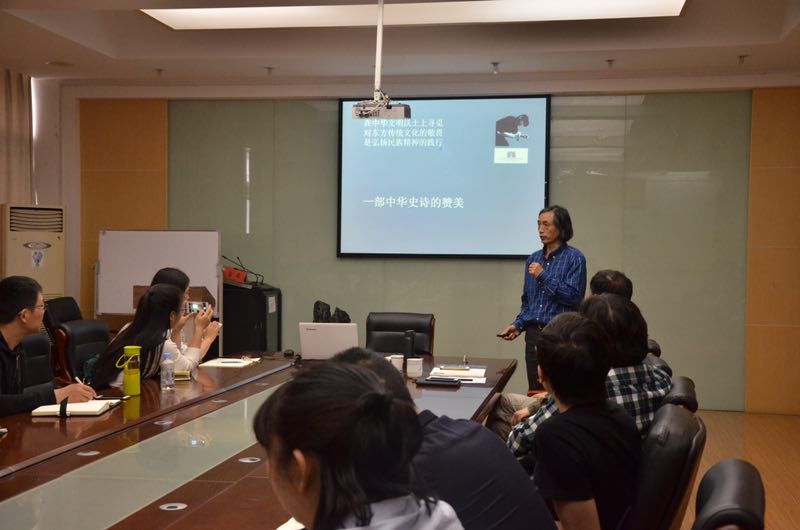 2018年5月5日下午,中国美术家协会版画艺委会委员、国家艺术基金评委、西南大学437ccm必赢国际版教授戴政生先生,应邀在437ccm必赢国际版会议室举行一场题为“史诗气象——中华文明历史题材美术创作工程《孝治天下》创作历程”的学术报告会。437ccm必赢国际版广大师生、国家艺术基金《徽州砖雕创意设计人才培养》项目培训班学员和芜湖市版画爱好者等70余人前来聆听并参与了互动交流。