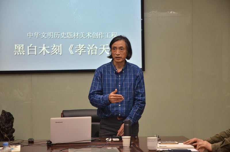 戴政生教授在报告会上,首先介绍了由中宣部、中国文联、财政部、文化部自2011年联合实施的表现中国在1840年以前所发生的历史事件、杰出人物和文明成果的主题性美术创作工程情况,以及项目(作品)初期申报、评审、入选等过程。中华文明历史题材美术创作工程,继2009年《国家重大历史题材美术创作工程》面世之后,又一由国家政府部门组织实施的大规模主题性美术创作活动,吸引了我国当代美术界最具实力的老中青优秀艺术家的参与,在千余件投稿中,经过专家多轮遴选,最终确定146个选题,由入选艺术家创作完成,体裁涵盖中国画、油画、版画和雕塑。