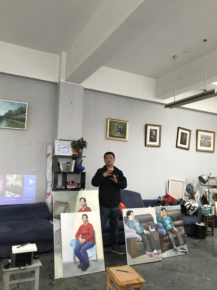 叶勇教授主讲的课程为《油画全身像》。由于讲授对象为大二的学生,初步接触油画全身像,叶勇教授从点评课堂学生画作开始,指出由于教师教学时间、学生作画时间有限,作画时学生应选取自己最感兴趣的角度,注意画面的构图。随后叶勇老师为同学们播放了一段冷军的教学短视频和一些优秀的油画作品照片,意在强调油画全身像起始阶段的关键性问题。叶教授展示了一些学生作品,指出创作中应注意的问题:第一步是空间,注意人物动态和大关系;第二步是画面处理,注意画面节奏的形成。最后,叶勇老师为同学们详细地讲解了油画中“油”的种类和使用方法。