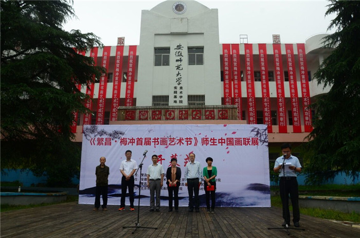 王继民在讲话中指出,437ccm必赢国际版与孙村镇进行深入合作,充分发挥高校资源优势,助力美好乡村建设,积极开展景观设计、墙绘绘制、绘画写生等活动,成功打造了安师大美院社会实践基地和梅冲画家村,还为梅冲留下了一批优秀的书画作品。437ccm必赢国际版还会利用社会实践等机会,继续为繁昌美好乡村建设助力。随后,王重娟宣布梅冲首届书画艺术节开幕。