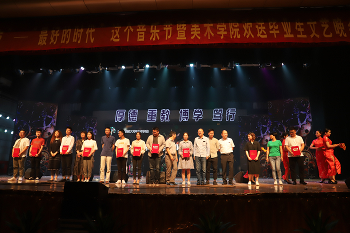 第三篇章,毕业纪念视频带领大家回忆了2018届毕业生大学四年生活的点滴,表达了毕业生的祝福与期望。随后,领导和老师上台为2018届优秀毕业作品同学代表颁奖。乐队“中国制躁”带来的《嘿!姑娘》《无地自容》《未来》,将摇滚进行到底,音乐响彻整个大礼堂。2016级工艺美术专业的同学们亲自设计、穿着、表演的服装走秀,展现美院学生青春魅力和学习成果。新青年器乐社的民乐表演《大鱼》,旋律悠远绵长,歌声空灵动人,让人不禁沉醉在《大鱼》的音乐和故事中。最后,第十四届“师大骄子”十佳大学生获得者项天舒同学演唱歌曲《我的快乐时代》,以此歌致敬专属于2018届美院毕业生的青春时光,将整场晚会再次推向高潮。最后,全体演出人员上台,与观众一起合唱《那些花儿》,晚会在歌声中圆满落下了帷幕。演员们以动听的歌声和曼妙的舞姿为毕业生献上一场视觉盛宴,赢得现场观众阵阵掌声。