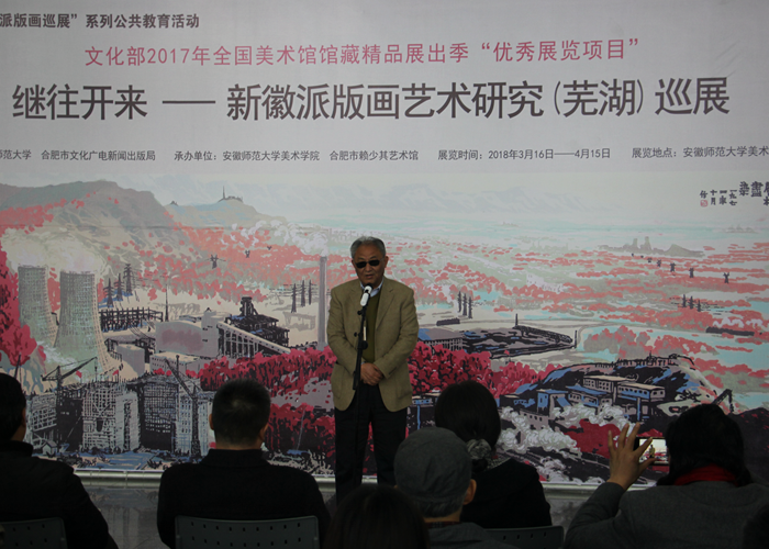合肥市赖少其艺术馆馆长于在海在致辞中表示,此展是安徽省第一次全面研究和充分展示各历史阶级徽派版画艺术发展的重要活动,突出了新徽派版画创建发展及承先启后的历史作用,体现了区域文化的研究传承,具有深刻的学术内涵和强烈的艺术特色。