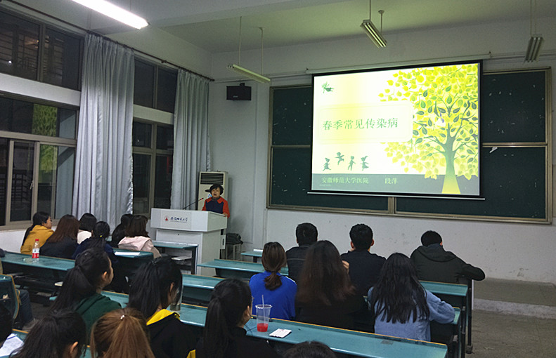段萍首先从什么是传染病,传染病一般传播途径,传染病的应对技巧等讲起,接着以流行性感冒、水痘、结核病这三种春季高发传染病为例,从常见症状、传播途径、易感人群和预防措施四个方面向同学们作了详细介绍,并传授了非常实用的春季饮食营养方面的注事事项。
