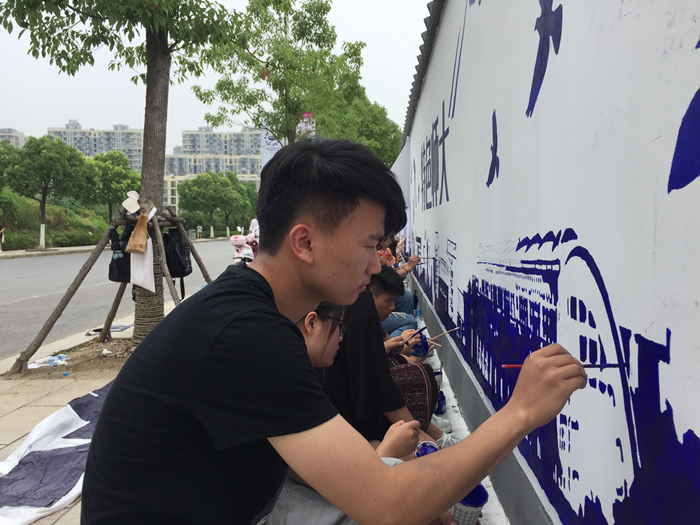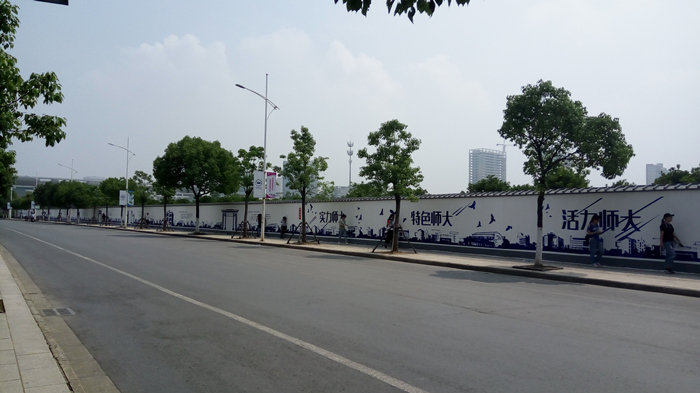 经过了前期墙绘的绘制内容的设计和基本绘制,团队在五月中旬开始进行最重要的中期的墙绘创作。首先,队长组织团队同学们对安师大历史变革更进一步地深入学习与了解,将“厚德、重教、博学、笃行”的校风学风传播下去,将科学严谨的美术创作理念传承下去。在中期创作实践中,团队的同学们充分利用课余时间,在前期绘制方案的基础上进一步进行绘制。不管是头顶的蝉鸣阵阵、地表温度达到近32摄氏度,还是闷热的雨水纷纷、夜晚的蚊虫叮咬,大家都默默坚持着,不抱怨不埋怨,在绘制中进一步回顾校史。不过没有什么总是一帆风顺的,我们在最关键的中期创作中也遇到不少困难,其中最大的难题便是绘制方案的调整。当时创作团队基本已经将主题部分绘制完毕,而这时要修改方案是很困难的,这不仅需要团队的队员们提出更多的想法和方案进行深入的讨论,还需要专业的墙绘创作人根据学校提出的建议进行重新设计调整。大家暂停手中的画笔,一起坐下来讨论、商议,虽然期间大家也因意见的相左而进行了激烈的争论,但这并不影响我们这个创作团队的友谊,相反,在这一次的磨合中,大家的心联系得更紧了,因为大家都为了丰富校园文化,为更好的美化校园环境。调整方案确定下来后,为了赶上前期制定的绘制进度,在此期间437ccm必赢国际版的优秀学生代表们也充分利用课余时间前来帮忙。中期调整后的绘制内容也在大家的共同努力下顺利完成了。