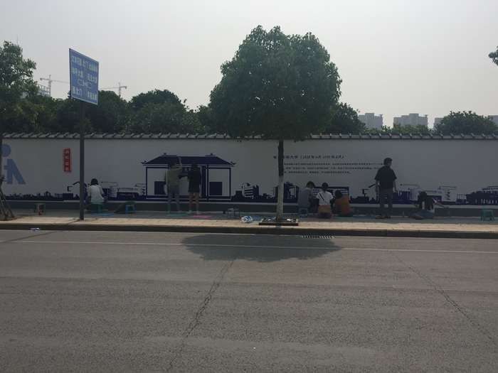 六月中旬,团队开始后期绘制创作。这一阶段主要是将前期和中期的绘制内容进一步修缮和补充,虽然后期的创作过程看似简单,但其实是最为关键的。这需要创作团队的同学们在逐渐变热的天气下更加聚精会神、更加精细地修整完善之前的绘制内容。为了防止中暑,我们将白天的绘制时间缩短,加长晚上的创作时间,大家早晨6点半便开始进行创作。下午太阳还未下山时,大家又背顶着夕阳,脚踩着不断上冒的热气坚持不懈着。许多路过的同学、老师、运动完的大爷大妈、放学后的孩子们都驻足欣赏,并询问队员们的创作过程和创作手法。很多退休教师在这面校史之墙前停留,他们品读着墙上的校史,重温过去,向队员们讲起他们那些年代的记忆,也对大家认真、精细的创作和绘制给予肯定和赞扬。路过的老师和同学们忍不住举起手机拍下这些动人的背影。看着大家对我们团队创作的肯定,大家的心到了莫大的鼓舞,即使再辛苦再劳累也在所不辞。