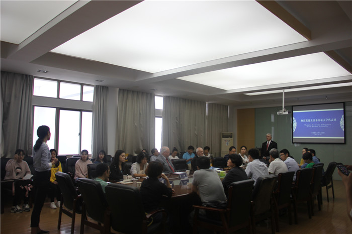交流会伊始,Dr. Edward一行与美院师生代表一一握手问好,并表达了与学生交流“迫不及待”的心情。Dr.Edward和朱家存校长就学生和家长关切的合作办学情况做了详细地解答、说明。为了学生能够顺利完成学业,双方就如何在协议框架下创设更为有利的条件交换了富有建设性的意见。比如,为了更好地适应后两年在美国的学习、生活,布莱诺大学每学期都会派出教师来我院为学生授课。