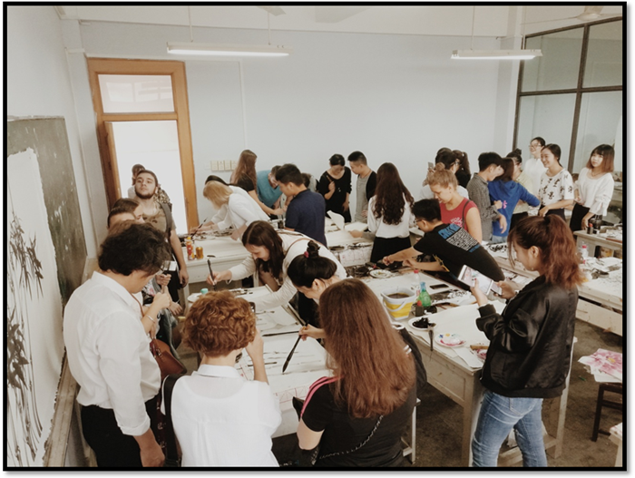 米宁大学的师生分别参观了雕塑专业、工艺美术专业和国画专业教学。在雕塑教室里,他们观摩了2015级雕塑专业的泥塑人体课程,聆听了刘超老师深入浅出的专业讲解。在工艺美术专业教室里,刘光老师引导米宁大学师生欣赏了美院学生的漆器作品,俄罗斯师生被独具中国特色的漆艺所吸引。在中国画课堂上,赵文坦老师给学生们展示了中国写意花鸟的作品,并让俄罗斯同学亲手感受中国画特有的工具——毛笔及其水墨在宣纸上特殊效果,体验极具特色的的中国画魅力;吴冬声老师在他的工笔人物课堂上精心设置了互动环节,让美院同学一对一地为俄罗斯同学写生,活动结束后,这些作品作为纪念品赠送给俄国同学。整个参观活动温馨、愉快。