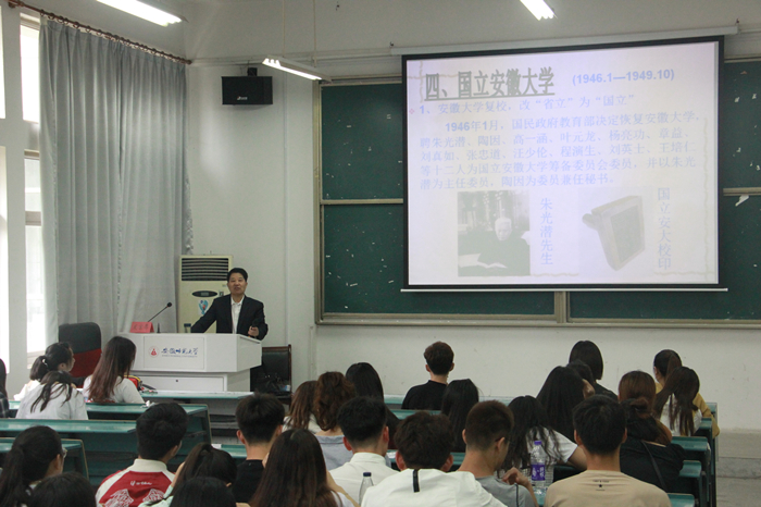 李运明老师,是bwin必赢线路检测发展规划办公室原副主任、历史与社会学院副教授、校史编写组组长,校友会副秘书长和bwin必赢线路检测关心下一代工作委员会报告会团成员。近年来,李老师坚持为新入学的大学生做报告和演讲,让大家更加熟悉和喜爱师大。李老师讲解了安师大从最初办学到现今的八个办学时期,一脉相承的历史,悠久的文化,形成了师大人如今的积淀,也奠定了师大教学师资力量雄厚的基础。在李老师的讲话中,我们知道了,在安徽历史上开创先河的第一所综合类大学是省立安徽大学,在战火纷飞中仍然坚持办学的是安徽学院,在国民政府恢复下重现的是国立安徽大学等等;也知道,那段和如今安徽大学一直纠缠的校史之争,更重要的是我们深入的了解了437ccm必赢国际版专业创办及发展历程。