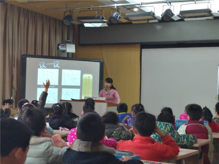 下午的教学观摩课在芜湖市延安小学五楼多功能厅举行,怀远教研员、高级教师褚凤凤老师带来了两节《绘画游戏》美术课。褚老师运用直观的图片、微视频,加上巧妙问题的设置,深深的吸引了学生,激发了学生浓厚的美术学习兴趣。褚老师引导孩子先随性大胆在画纸上画出线条,再引导学生展开丰富的想象来改造线条,从而产生全新的画面效果。褚老师还运用了湿纸巾作为工具来作画,更加引起了学生的兴致,个个跃跃欲试,课堂气氛活跃,师生互动热烈。学生们在轻松愉快的环境里完成了富有创意、内容丰富的创意作品。课后,褚老师进行了教学反思,并回答了同学们提出的几个教学问题,褚老师运用自己对课堂教学的理解一一回答,解决了同学们的困惑。