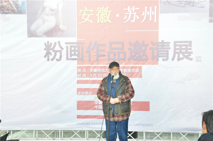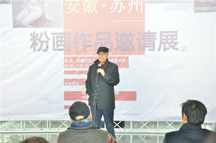 卢卫星代表苏州市美协和参展方在会上发言。他指出安徽艺术家和苏州有着深厚的情谊,有一批从安师大走出的艺术家在苏州院校中发挥着重要作用,创作出了许多美术作品。近年来,粉画艺术在杭鸣时先生的倡导下得到了比较大的发展,他希望通过举办这种交流形式的画展,推动粉画艺术创作,为粉画艺术发展做出更大贡献。