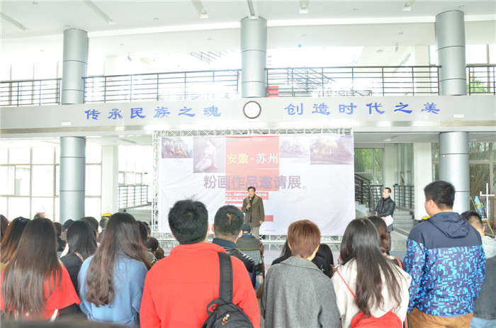 高飞代表437ccm必赢国际版为本次开幕仪式致辞。他向在座师生介绍了粉画艺术的发展历程,并简要说明了安徽·苏州粉画作品邀请展的缘起。他指出本次粉画作品邀请展集中地展示近年来粉画队伍的成长,反映了近几年粉画在创新活力以及艺术表现力等诸多方面的可喜进步。从这些作品中也反映出老一辈的粉画画家仍然具有较强烈的创作热情,同时新一辈的中青年粉画画家也迅速成长起来,为粉画作品的创作提供了可靠的人才支撑。