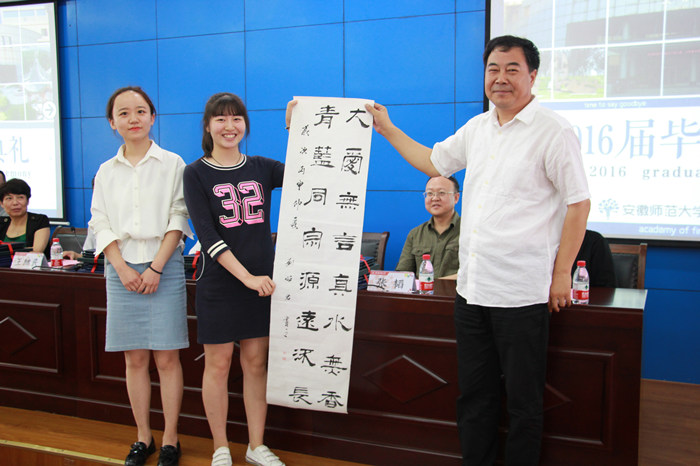 2013级环境设计专业王秋雯代表在校学生表达了毕业生们对学弟学妹们的帮助和支持,并向毕业生们献上最真挚的感谢与最美好的祝福。毕业本科生代表陈天云和毕业研究生代表李果分别回忆了自己的大学生活,表达了对母校和老师们辛勤培育的感激之情。2012级绘画专业刘昭君代表毕业生向学院赠送书法作品,祝福437ccm必赢国际版蒸蒸日上。