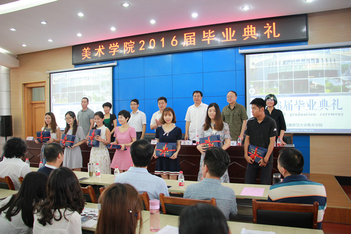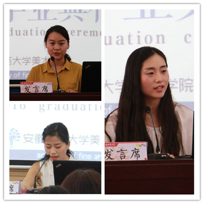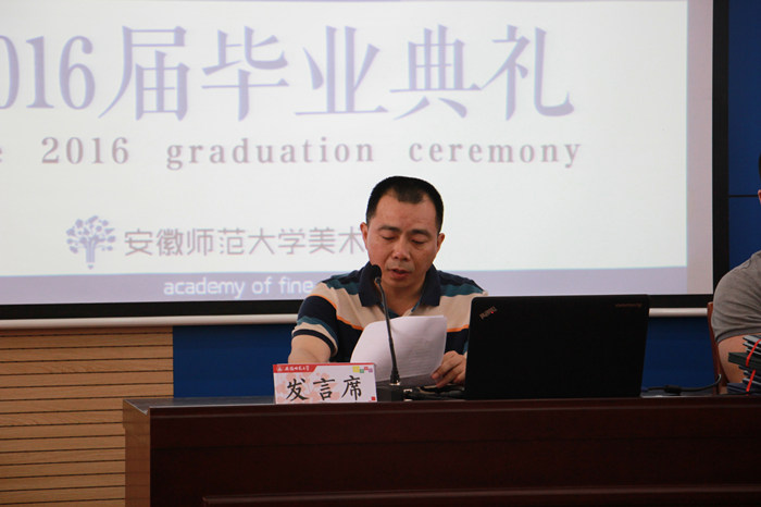 教师代表周群教授发表临别赠言,他希望同学们谨记师大校训和美院院训,踏实做事,诚实做人,以骄傲和自豪的面貌走向社会,努力实现自己的艺术梦想。