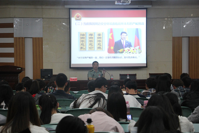 王道云上校从中国当前周边的国际形势、国家安全与青年学生的关系和参军入伍的相关政策三个方面展开讲座。王道云指出,当前我国安全环境面临着前所未有的机遇,但同时国家周边的安全态势仍面临着严峻的挑战。我国所处的亚太地区聚集了当今世界几乎所有的主要矛盾和热点问题,与此同时,我国采取的“东急、西重、南迫、北缓”战略取得了显著的效果。讲座中,王道云指出国家安全与每一位青年学生密切相关,保家卫国是每个公民义不容辞的责任。作为一名大学生,必须清醒地认识到当前的国际和国内安全形势,努力把自己塑造成为一名社会主义事业的建设者和接班人。讲座最后,王道云讲解了相关的征兵入伍政策,希望同学们积极加入中国人民解放军队伍,融入这所培养人、锻炼人的大学校。