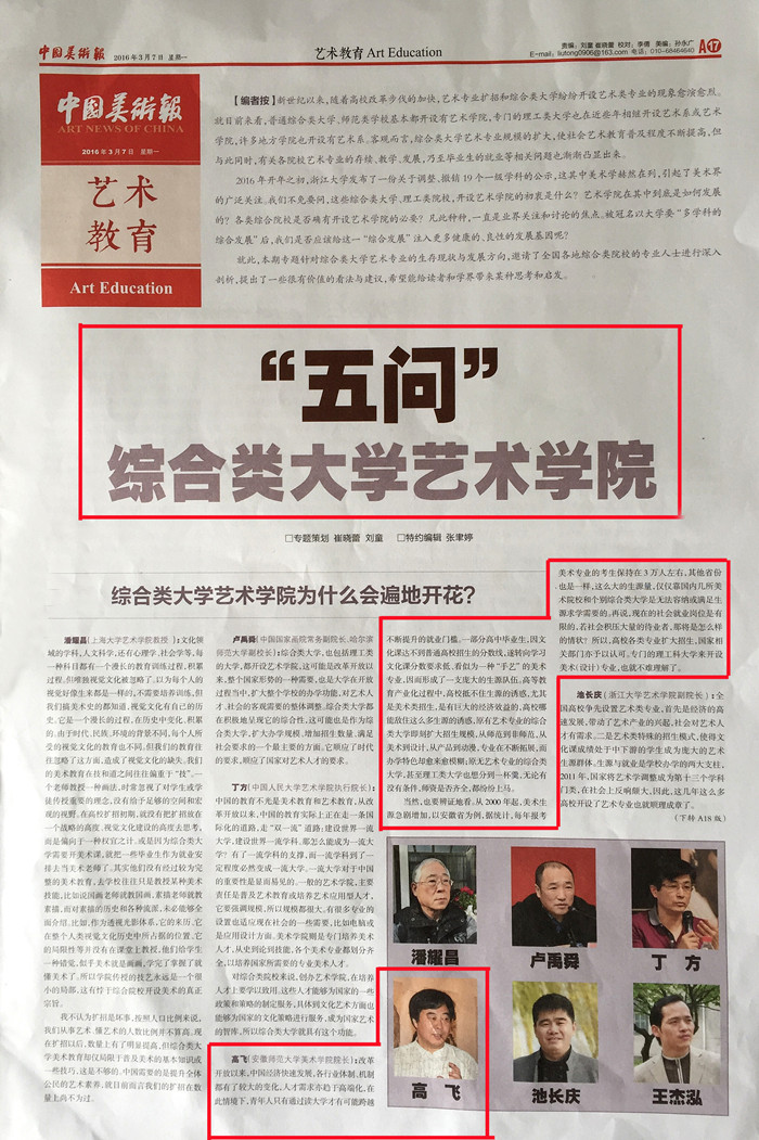本网讯(437ccm必赢国际版 李高举) 近日,《中国美术报》在专栏《艺术教育》中,以“‘五问’综合类大学艺术学院”为题,报道我校437ccm必赢国际版院长高飞教授对当前综合类大学艺术专业现状与发展方向的理解。