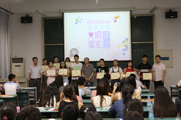 2013级辅导员文武首先宣读了寝室卫生评比规定,包括评比等级、评比注意事项,他号召同学们以评比为契机,加强寝室文化建设。学院团委副书记谢传斌宣读了获得文明寝室、文明寝室标兵和优秀寝室长的名单。随后2012级环境艺术设计专业学生刘永晖代表优秀寝室长从卫生情况、学习情况和人际关系等三个方面做了简短的发言,希望同学们珍惜来之不易的缘分,相互包容,相互帮助,共同营造温馨和谐的寝室氛围。