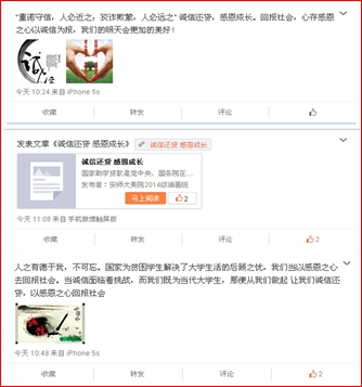 诚信教育“微”传递活动是通过新媒体——微博,利用安师大美院资助育人官方微博广播征信、金融等相关知识,助学贷款等政策以及诚信教育宣传语等内容,号召各班微博转发并带领班级同学学习了解相关内容。
