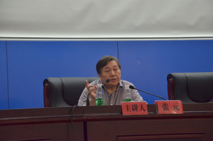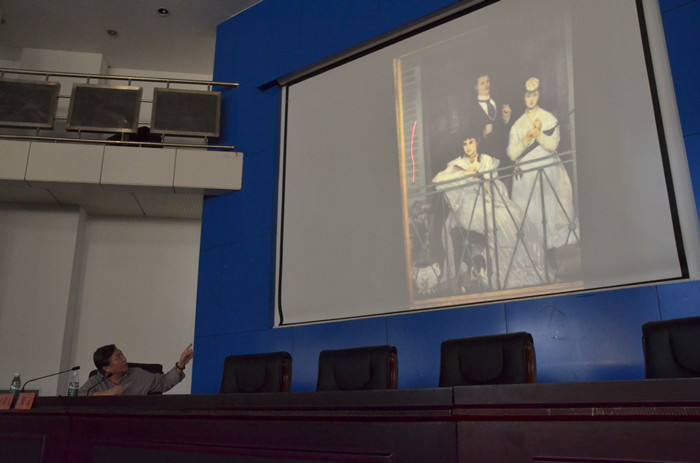 讲座中,张元教授向在场师生展示并讲解了200多幅不同国家、各个画派在不同时期的优秀画作。他从梵高、塞尚、毕沙罗等印象派画家的油画作品来分析绘画的发展和综合材料绘画与实验艺术绘画领域以及在绘画创作中色彩语言运用方法。张教授从条件色、固有色、观念色三大色彩体系中细致分析油画作品中表现的色彩语言,带着在场师生回顾传统绘画从具象到抽象的发展,认识印象派绘画色彩运用从客观到主观的过程。讲到美术教育,他对当今美术教育的发展表示肯定,同时也指出各院校在专业教学上色彩方面存在的诸多问题,并提出教学以创作带基础的主张。而后同学们从自己的专业出发提出了一系列问题,张教授从自己的研究方向和经验一一进行了细致而有耐心的回答,现场气氛轻松活跃,在场师生获益良多。