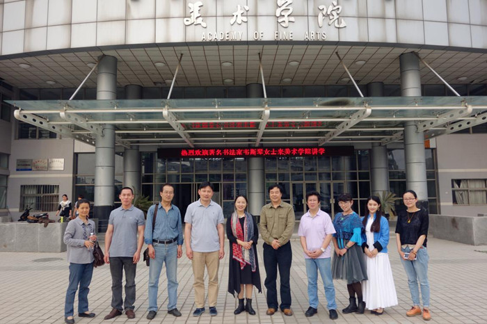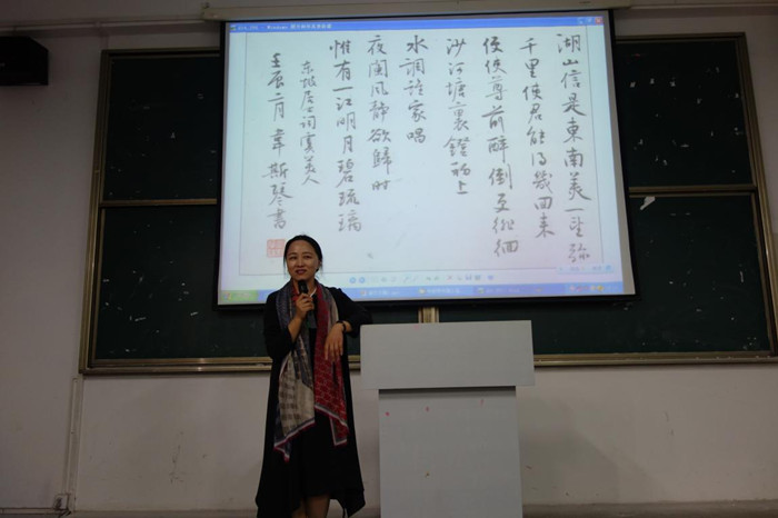 韦斯琴女士通过自己对色彩情感独特的感悟,引导学生们重视在美术创作中个性化的表现。她告诉学生书画艺术不仅需要严格的技法训练,更需要通过读书、阅读自然来领悟爱,表现爱。讲座以自己的书法作品为例对艺术语言的表现形式和内容作了精彩的讲析,她以淡定的心态,唯美的冲动展现了自我,并将对美的感悟融入自己的作品之中,加之以诗书画文的形式,使之作品有清雅、润泽之韵味。讲座犹如斯琴老师本人优雅、聪慧、美丽,给同学们留下了美好、难忘的记忆。