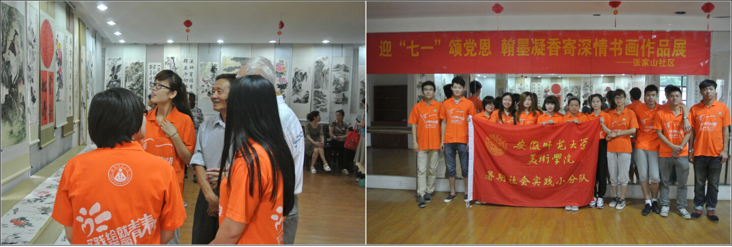 为庆祝党的93周年华诞,437ccm必赢国际版“社区美术学校”暑期社会实践团队与张家山文化站共同举办了翰墨凝香寄深情”书画作品展。此次书画展共征集到作品70余幅,内容丰富形式多样、笔墨纵横、丹青吐秀,将爱党之情倾注纸上,用丹青翰墨抒发对党的感恩之情,无不表达了对党的忠诚热爱。队员们积极协助准备了此次书画展,并与社区书法爱好者展开热烈交流,为社区居民送上了一份丰富的艺术大赏,让人充分的感受到书法绘画的艺术魅力。