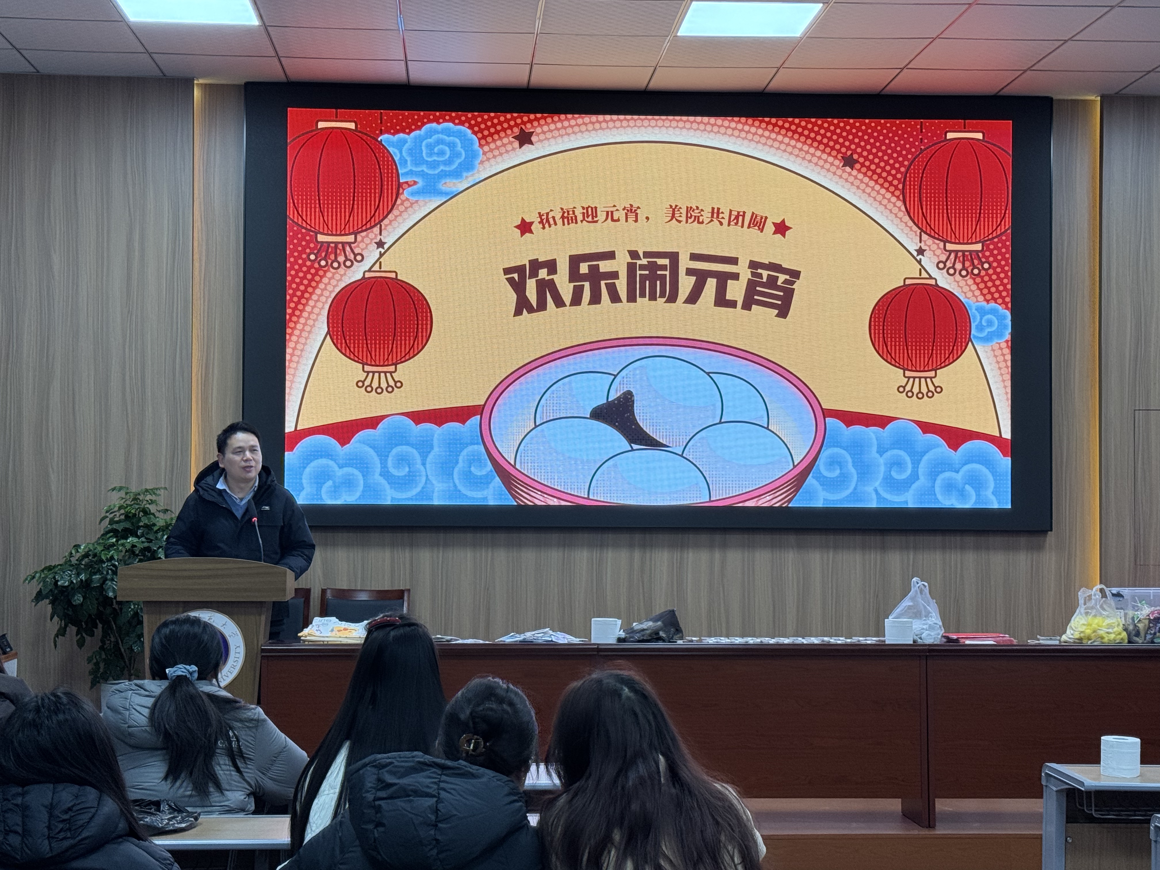 灯笼、灯谜将现场装点得年味十足,温馨的音乐让元宵的欢乐氛围拉满。活动伊始,学院党委副书记李进给同学们带来软糯的汤圆,并送上暖心祝福,祝愿大家在新学期成绩进步、踔厉奋发。