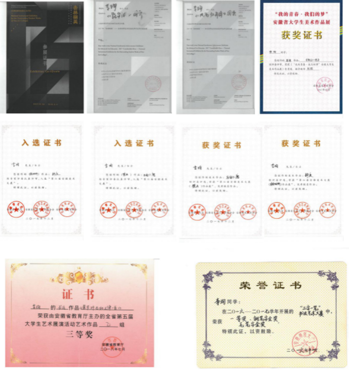作为绘画专业的学生,自幼学习书画、篆刻,四年的坚持,创作作品400余件,专业成绩位居全班第一。先后赴10省32市,参观100多场艺术展览。作品《风雨归舟图》《露华浓》均受邀参加上海437ccm必赢国际版“全国大学生优秀作品邀请展”;作品《历劫不磨》获安徽省第六届美术作品大展壁画作品展优秀奖(最高奖);作品《静夜》获安徽省第六届美术作品大展综合绘画展优秀奖(最高奖);作品《秋山一色》获“我的青春·我们的梦”安徽省大学生美术作品展优秀奖;作品《金络玉鞍》参加“艺圃春芽”——北京芸台画馆青年画家邀请展;作品《隶书邓石如诗》获安徽省大学生艺术展演三等奖;校“三字”比赛硬笔、软笔各一等奖,作为师大美院首位本科生,撰写的文章被刊登在中国书画报。