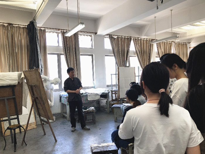 在现场写生环节中,汪荣强老师对人物造型方面的体积形态、绘画语言中的笔勾墨染等问题进行了深入的阐述和直观的示范,使得学生在耳濡目染之中感受到中国人物画独特的艺术魅力,教学效果良好!