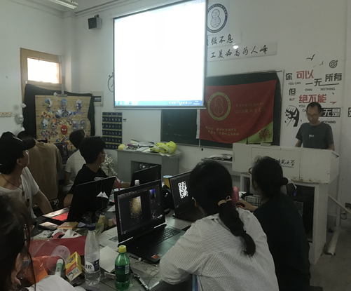 课程伊始,方政老师用先行备好课的作品图片导入,为我们讲授电脑设计里的的软件用法,他以Photoshop为例,对其中的功能如快捷键等的操作方法进行了一一讲解,讲解过程仔细、耐心,对于同学们提出的问题也进行了细致地解答。通过他细致地梳理和耐心地辅导,学生的疑点被即刻解决了。