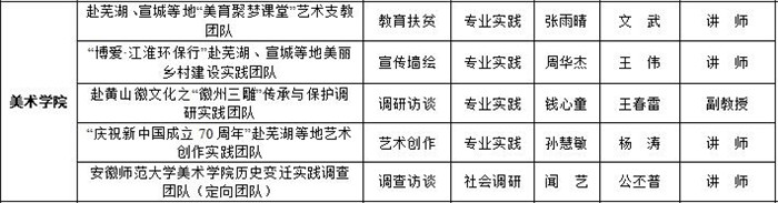437ccm必赢国际版2019年暑期社会实践以“青春心向党 建功新时代”为主题,紧紧围绕专业,突出美院专业特色,开展“美育聚梦课堂”爱心支教、助力美丽乡村建设、“庆祝新中国成立70周年”艺术创作和徽文化之“徽州三雕”传承与保护调研实践等社会实践活动,持续接力打造实践育人的品牌。在立项过程中,强化专业教师团队指导,做到每一支团队都有教师指导,每一支重点团队都有教师全程跟队实践。