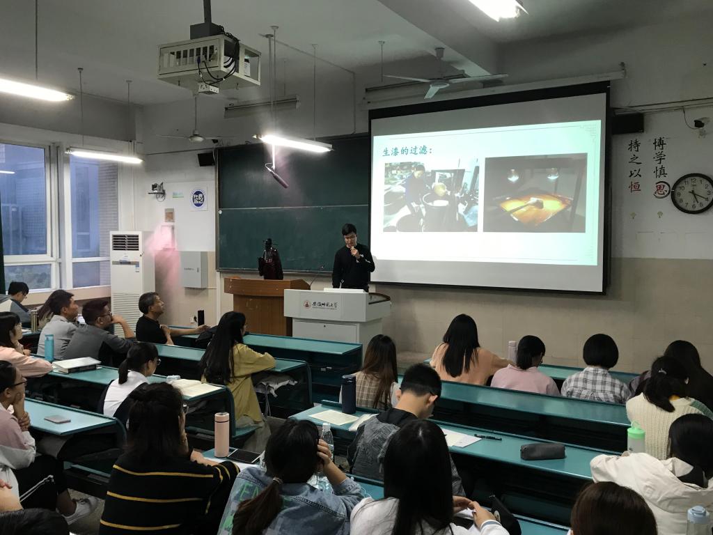 讲座中,先由徐浩楷老师为大家介绍了生漆以及生漆的历史,紧接着由徐建武老师为大家讲解了夹纻工艺的流程——“生漆夹纻”源于春秋战国时期,其制作工艺是漆艺中难度最高的。其主要原料是天然生漆、天然纻布及瓦灰,作为漆塑像的方法,先用泥塑成胎,后用漆把麻布贴在泥胎外面,待漆干固后,反复再涂多次,形成纻壳后把泥胎掏空,塑像便成型,最后经打磨,髹饰等几十道工序制作成精美的工艺品。用这种方法塑像不但逼真,而且质地很轻。徐老师还给大家分享了夹纻工艺的传承谱系列,1986年徐老师跟随著名雕塑家中国美院教授陈鹤亭先生学习雕塑,成其关门弟子。