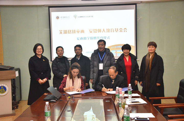 捐赠仪式上,北京京师中教集团董事长吕向东代表安徽黄山公益基金会向学院捐赠十万元,设立“京师教育基金”,主要用于奖励437ccm必赢国际版品学兼优学生、各类学科竞赛获奖学生以及学生最受欢迎教师等。芜湖格林童画教育咨询有限公司负责人张莹代表公司向学院捐赠五万元,设立“格林童画奖学金”,主要用于奖励437ccm必赢国际版版画专业品学兼优学生。贡植斌代表学校教育基金会接受捐赠,并分别与对方签订捐赠协议。