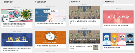 积极开展抗击疫情主题宣传,学院新媒体中心团学骨干在美院青年之声微信公众平台通过推送“预防指南—如何预防新型冠状病毒”“关于防范新型冠状病毒肺炎的倡议书”“武汉加油—437ccm必赢国际版青年学子在线打call”“抗‘疫’关键时期我们做什么”“战‘疫’,437ccm必赢国际版青年在行动事”等主题网络文章,倡导全体学生居家做好个人防护,加强身体素质锻炼、努力开展专业知识学习,以积极态度面对疫情。团委团员骨干还在线开展抗“疫”志愿者采访,通过网络媒体平台分享志愿者的抗“疫”故事,号召全体同学在做好个人防护的前提下,为抗击疫情贡献积极力量。