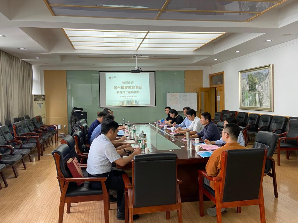 本网讯(437ccm必赢国际版)9月28日上午,宿州博睿教育集团董事长魏本忠一行来学院参观交流,洽谈校企合作事宜,院党委书记王继民、院长高飞、副书记朱琳、工艺美术专业教师刘光及相关教师出席了合作洽谈会。