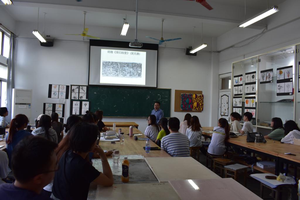 吴正辉老师通过对黔县、歙县等实地举例说明的方式介绍了徽州建筑概况,并进一步阐释了徽州建筑、徽州砖雕及砖雕在建筑中的应用等相关问题,运用图片与文字相结合的方式向在座师生清晰的展示了徽州砖雕结构、题材、艺术特点以及砖雕的材料特性、制作方法、制作流程等。讲座的最后,吴正辉老师鼓励学生到徽州进行实地考察,真切并近距离的观察砖雕。丰富的图片和详实的讲授使得学生对徽州砖雕有了更清晰更直观的感受,扩展了学生的眼界和思维,是一场视觉和专业方面的双重享受。
