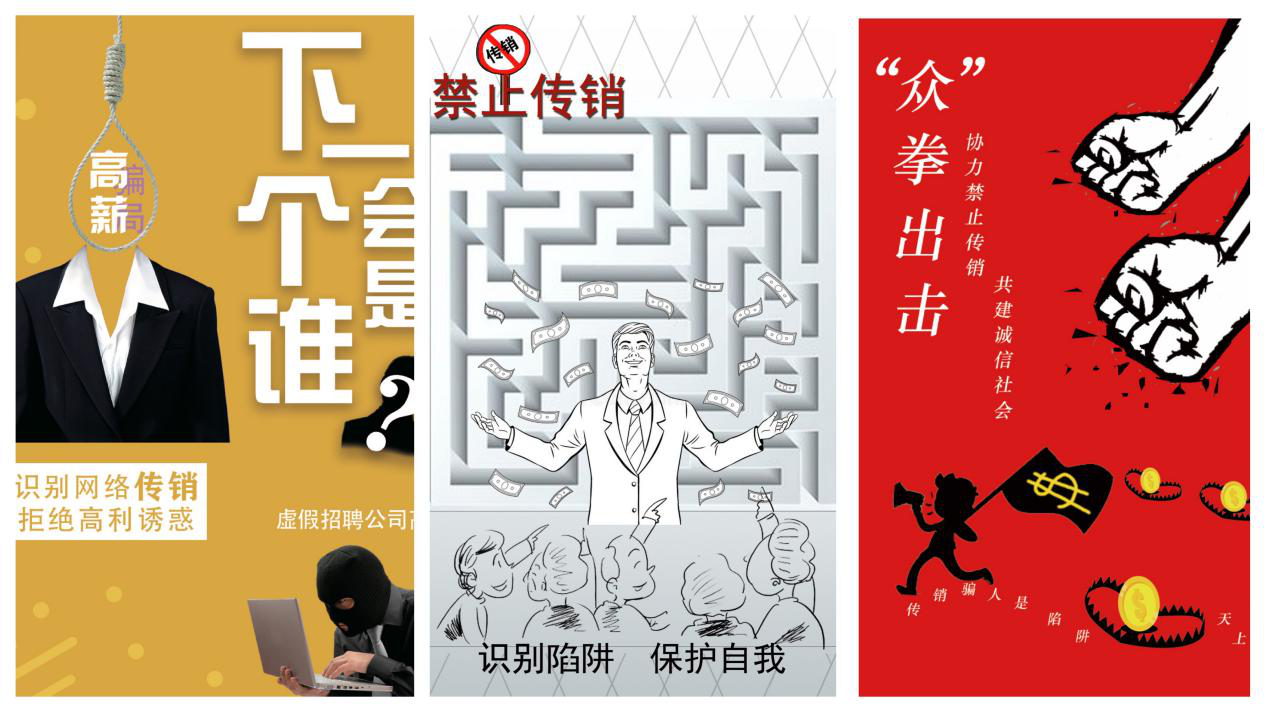 一次文艺创作。美术学院同学依托专业特色,发挥美术专长,根据防范传销主要内容,进行主题创作。2018级油画专业的韦锦清同学创作主题海报《识别网络传销》告诫同学们网络传销的危害。2019级视觉传达设计专业的韩明秀同学创作主题海报《“众”力出击》提醒同学们如果遇到传销组织,要拿起法律武器保护自己,不要陷入传销的陷阱。