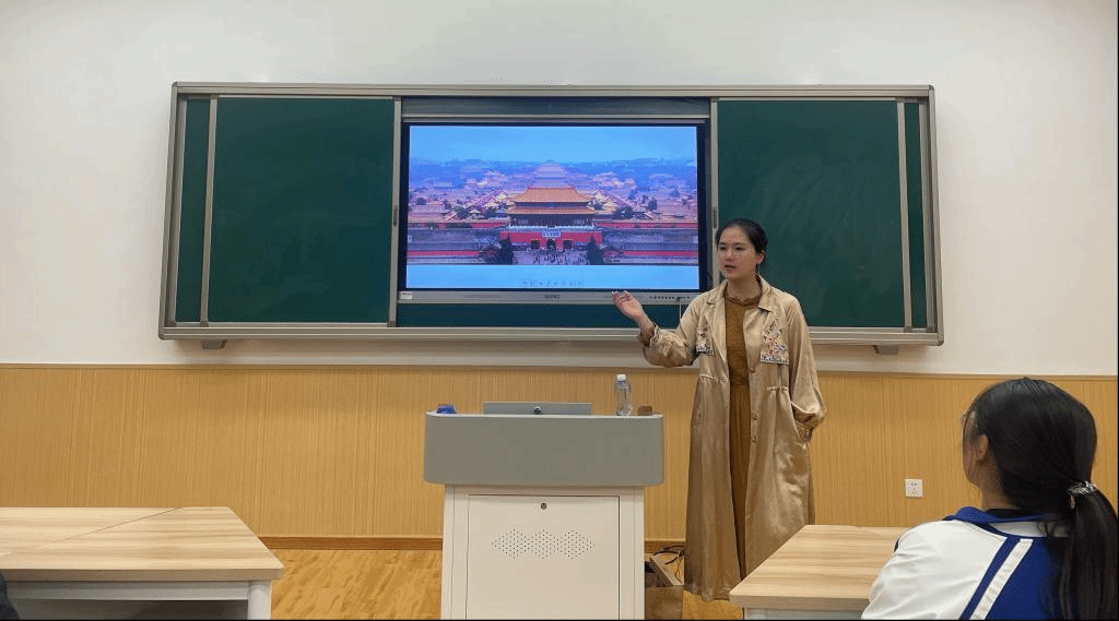 由表及里,道尽榫卯智慧。周雅馨老师首先通过“榫卯结构”的模型向同学们生动介绍了“榫卯”的发展历史与基本结构,同时结合亲身调研与收集的素材,比较中西方建筑的区别,让同学们感受中西方传统建筑与文化思想的不同,通过列举“故宫”震后不塌、“佛光寺”千年不倒的例子,说明了“榫卯”经久耐用、扛震性强的优点。师生高频互动,帮助同学们打开思维,使同学们不再对“榫卯”二字仅浮于表面,对“榫卯”文化也有了更深层次的理解。