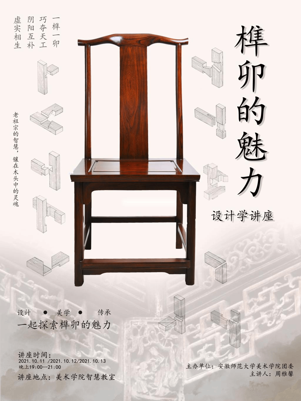 本网讯(437ccm必赢国际版 邵姚君 池佳怡)2021年10月11日至13日晚,437ccm必赢国际版为增强2021级设计学类新生对专业的了解与兴趣,在学院团委的支持下,环境设计专业周雅馨老师在437ccm必赢国际版A202智慧教室开展了《榫卯的魅力》专题讲座。
