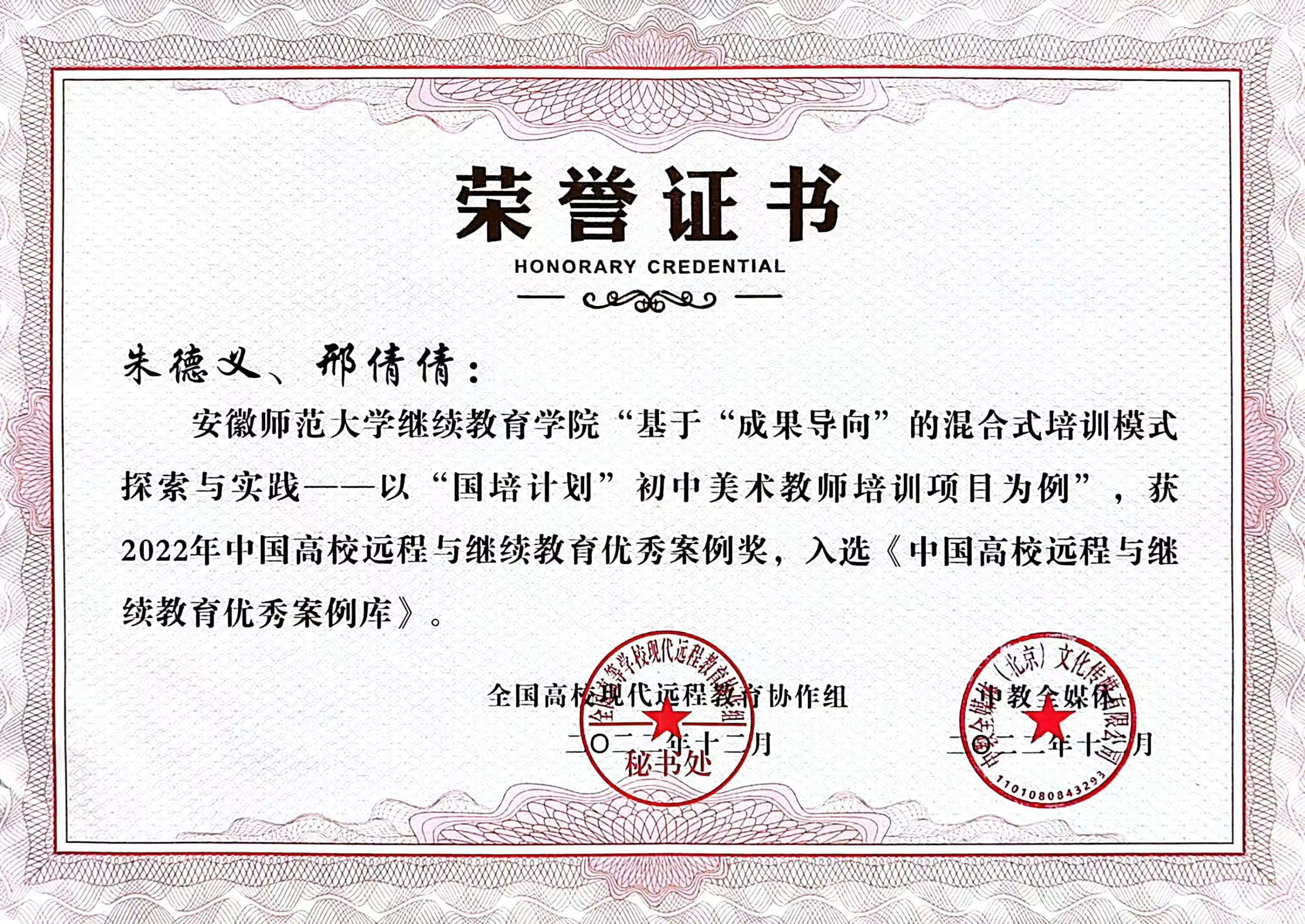 本次案例征集共收到全国各类典型工作案例200余份,经过评委会初审、互审和专家讨论,最终105个单位报送的146项案例入选。典型工作案例是“国培计划”项目实施的成果,是在培训项目体系建设、培训模式、培训方法、课程教学、管理改革等方面创新实践探索后的经验凝练。《基于“成果导向”的混合式培训模式探索与实践——以“国培计划”初中美术教师培训项目为例》案例是我院朱德义教授在主持实施安徽省美术教师“国培计划”中,聚焦培训重点问题,开展培训模式创新,并在实施中探索问题解决的新举措,最终凝练出了可推广、可复制的培训工作经验。该典型工作案例丰富了学校的培训资源,也是落实学校基础教育振兴计划的教师职后培训提升行动的具体举措。