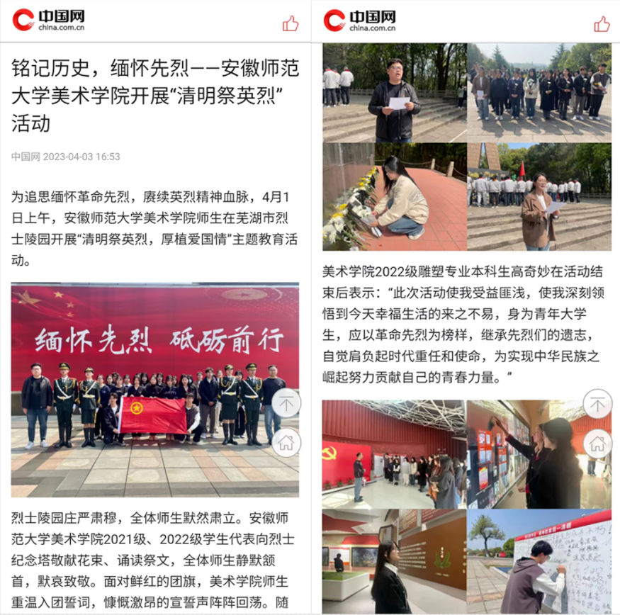 2023年4月1日,学院团委带领2021级、2022级学生在芜湖市烈士陵园开展“清明祭英烈,厚植爱国情”主题教育活动,学生代表向烈士纪念塔敬献花束、诵读祭文、默哀致敬,在鲜红的团旗下重温入团誓词并参观革命烈士纪念馆,活动受到中国网专题报道。