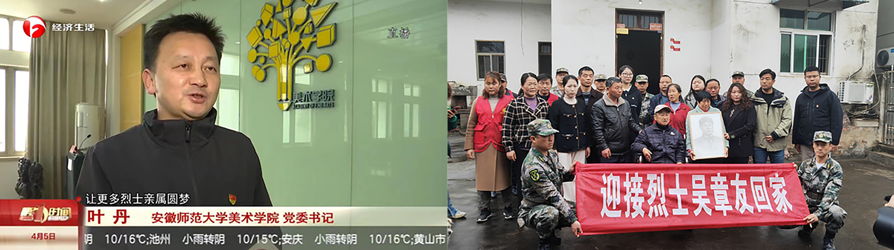 清明节前夕,437ccm必赢国际版2022级工艺美术专业学生吕毅、2022级美术学师范专业学生马雯靖将烈士周方振、吴章友的画像送至家属手中,受到安徽卫视、大江晚报等媒体长篇幅报道。