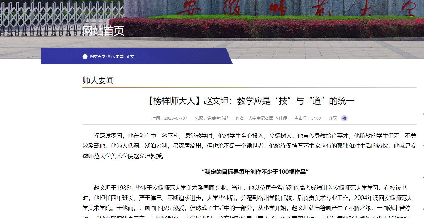 “技”与“道”交织在一起,他对中国画的历史进行了详细的梳理,将其置于中国文化史这个大背景下,并将文化自信落实到实处。通过对主要画派和重要画家作品的分析,找到人文精神教育的切入点,注重可行性和时效性。在润物细无声的教学当中,提升学生成绩。2019年、2020年、2023年在《安徽日报》《安徽省高校绘画专业应届毕业生创作选登》上分别刊登了赵文坦工作室韩秉华、邵珊珊、杨梅的作品,获得了高度评价。据不完全统计,工作室的学生近几年发表论文、参加省级画展在30篇以上。