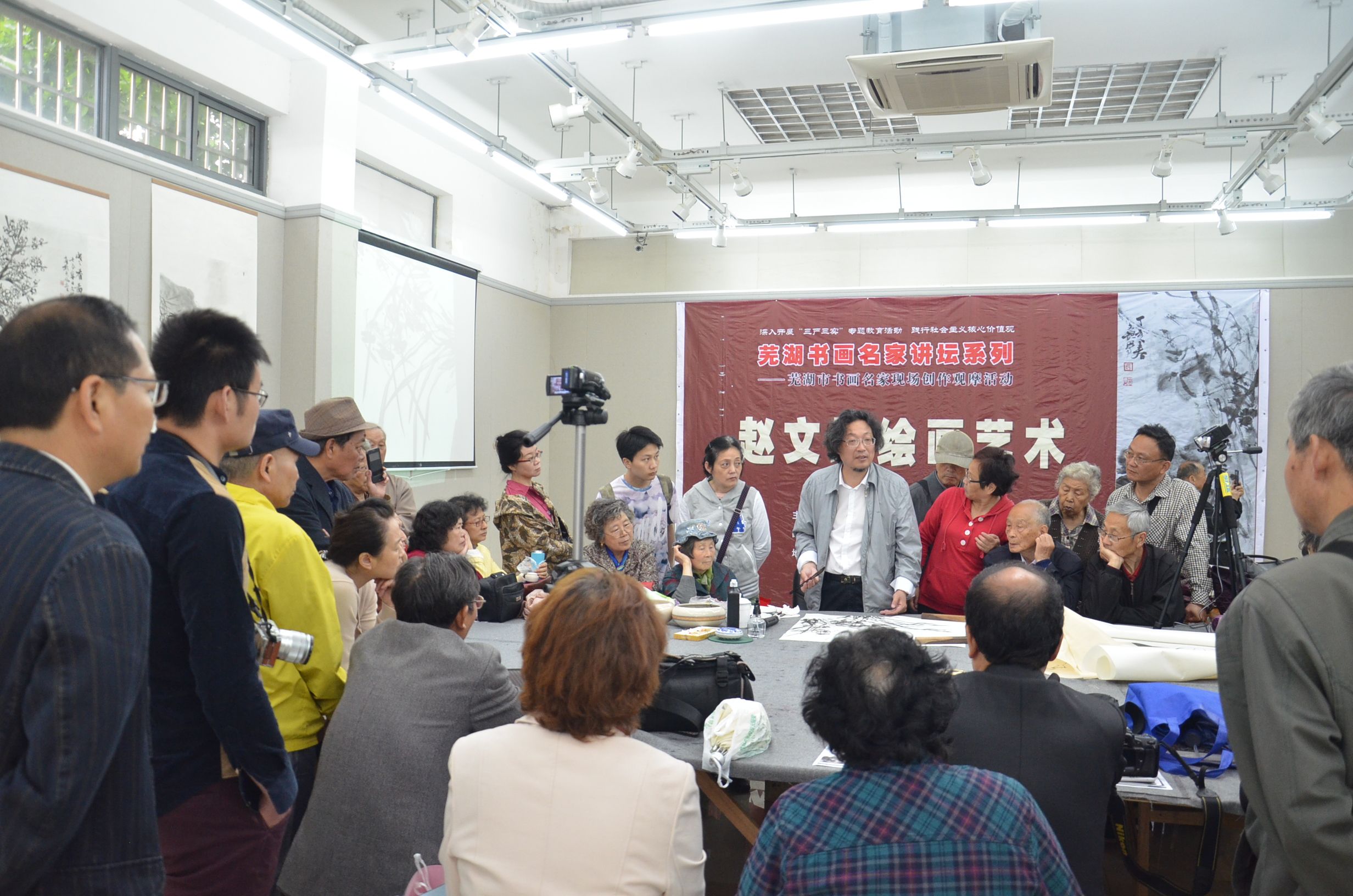 为学不能浅尝辄止,几十年来,赵文坦始终专注于中国画的研究并灵活运用到教学上。中国画教学是美术教学中的重要内容,在讲授传统中国画技法体系的同时,也要贯彻人文精神的教育。“教学一定要认真,这是教师的天职。”赵文坦语重心长的说。在教案的设计上不断构思,在笔法上不断研磨,力求每一次课都能让学生技艺有所增进。美术教学一个重要的特点就是示范,理论教学与技法教学并重。“文化课与实践课都不能差,要互相促进。”他指着贴在工作室墙上的几幅示范作品,用浅显易懂的话语将美术教学的本质娓娓道来:“美术教育工作者和职业画家不太一样,职业画家注重个性化的彰显,那么作为美术教育工作者一定要按照教育规律来教学”,紧紧抓住美术教学的特点,精心设计教学环节,努力让每一节课都成为精品课。“画画讲胸有成竹,教学亦然。”赵文坦的全校公开课《梅花的画法》取得很大反响,他将热爱的诗词歌赋融入艺术创作中,梅花的“凌寒独自开”酿成了中国画美的感受与崇高艺术精神。