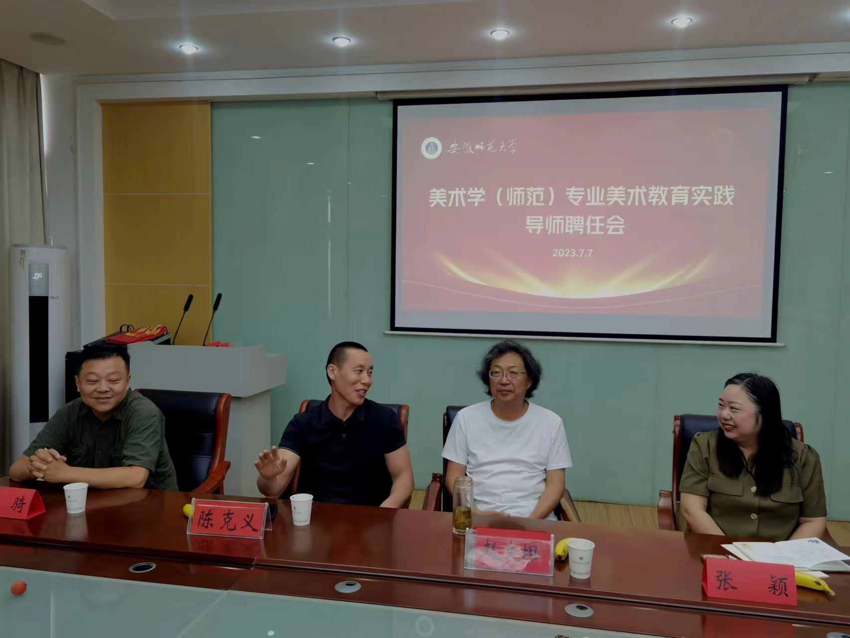 2023年7月7日下午,437ccm必赢国际版举行美术学(师范)专业美术教育实践导师聘任会,芜湖市美术教研员张颖,中小学美术名师李骑、袁芳、杨惠群、张贤媛、张飞、黄晨、俞晶晶,437ccm必赢国际版副院长陈克义、美术学系主任赵文坦和课程与教学论教师朱德义、程奇等部分教师代表以及2020级部分暑期留校同学参加了聘任会。