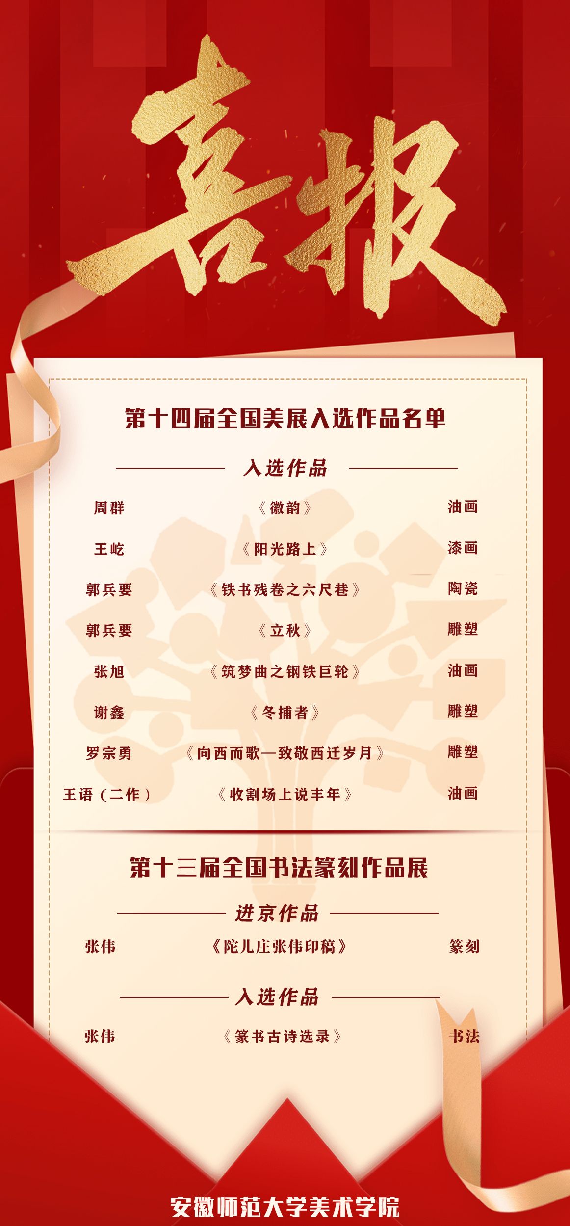 近日,由文化和旅游部、中国文学艺术界联合会、中国美术家协会主办的第十四届全国美术作品展览和第十三届全国书法篆刻展复评结果纷纷揭晓,经第十四届全国美术作品展览漆画、油画、雕塑、陶瓷展区作品复评评审委员会和第十三届全国书法篆刻展复评评审委员会评选,437ccm必赢国际版7名教师和1名研究生,共计10件作品入选,其中进京作品1件。本次入选作品数量和作品种类在安徽省高校位列第一。