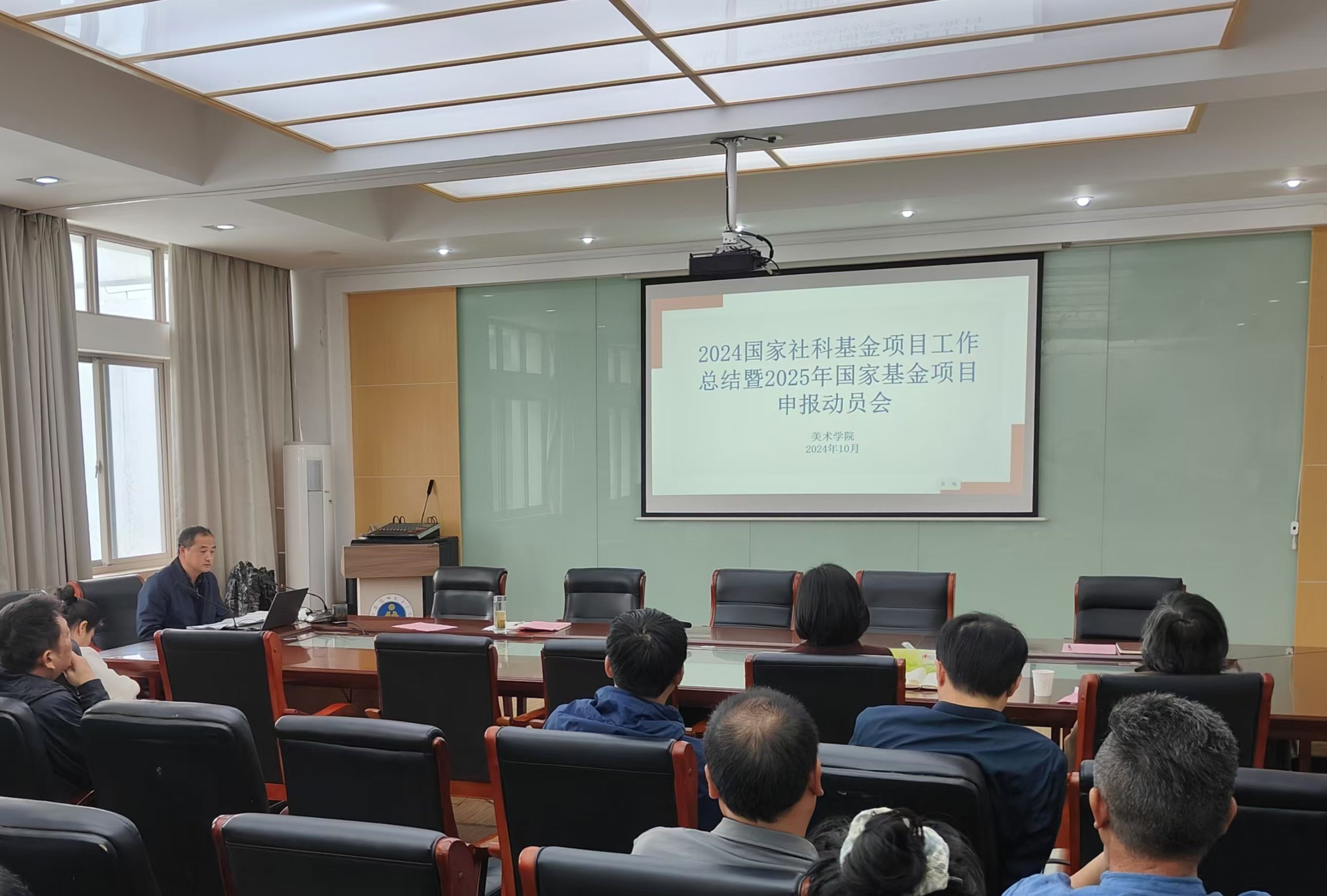 动员会上,王屹报告了学校2024年国家社科基金申报立项比较情况,总结了2024年学院国家社科基金项目总体申报以及立项情况,详细分析了学院科研人员实际情况,明确了2025年国家社科基金和国家艺术基金项目申报工作的思路、时间节点和注意事项并进行了任务分解,鼓励全体教师积极响应申报,力争在新一轮申报中实现学院国家社科基金项目和国家艺术基金项目申报与立项新的突破。会上还就2025年度安徽省哲学社会科学项目申报注意事项和全国美术展览创作做了详细解读。