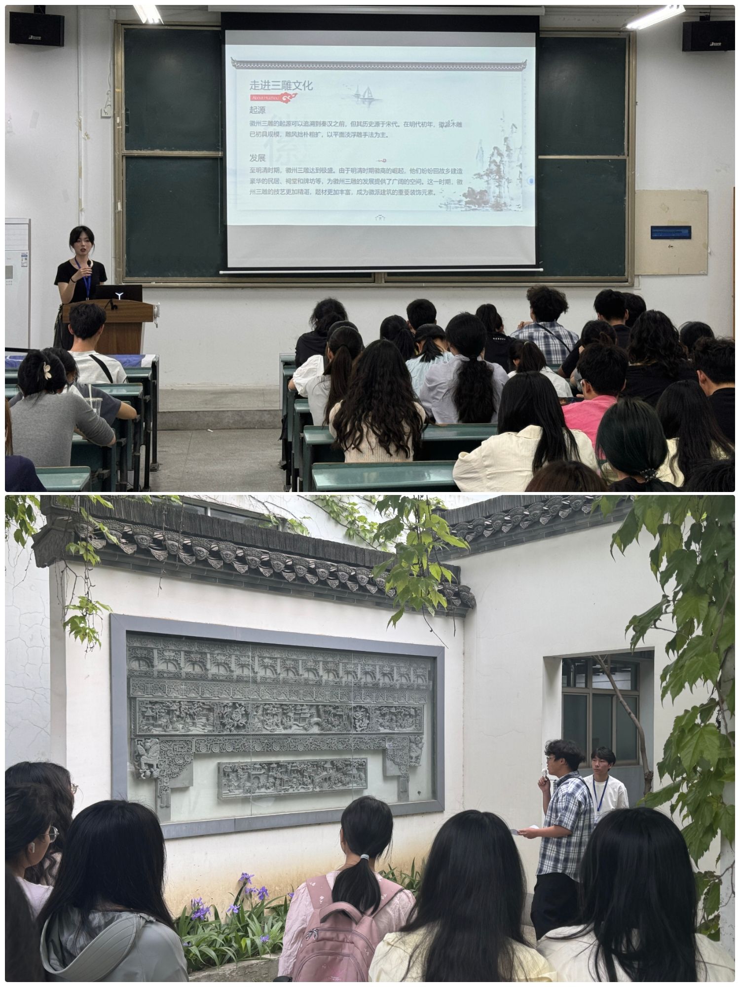 活动伊始,“徽州三雕”志愿服务团队的骆瑞以“科举人的人生轨迹”为主线,通过图文影像与实物展演,系统梳理了徽州三雕的历史脉络。她结合《渔樵耕读》《琴棋书画》等经典雕刻案例,深入解读了徽派建筑中蕴含的“读书入仕”精神,生动阐释了传统技艺与儒家德育思想的深层关联。理论讲解后,师生们移步437ccm必赢国际版徽园,近距离观摩徽州三雕实体作品。在《荣归故里》《百子图》等木雕、砖雕、石雕珍品前,参与者通过导师的现场导览,切身感受“以刀为笔、以艺载道”的非遗美学魅力。